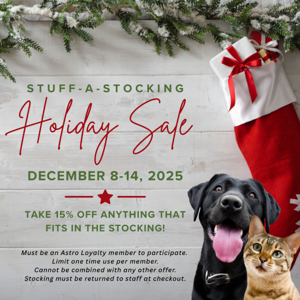 Anything that fits in our provided stocking will be 15% off at checkout! It’s the perfect time to shop for treats, toys and canned items for your pet. See a store associate to join in on the fun! One time use & must be an Astro Loyalty customer for redemption. ![]()